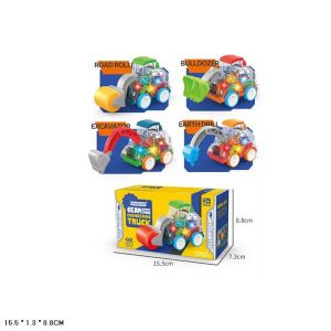 Машинка має прозорий корпус, за яким видно усі шестерні. Під час руху шестерні починають обертатися, привертаючи увагу малюка. За допомогою такої іграшки малюк розвиває рухові та слухові навички, тренує пам'ять, уяву та фантазію. Функції: - їде, - відштовхується від перешкод, - звук, - світло