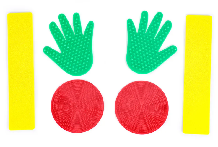 Елементи можна розташовувати як на столі, так і на підлозі. Навчальна гра може полягати у проходженні "доріжки" з викладених елементів, з попутним виконанням завдань - на який елемент потрібно наступити, якого доторкнутися, сісти чи підстрибнути. Якщо елементи розташовані на столі, то дитина може повторювати за дорослим комплекс дій – до якогось елемента доторкнутися долонею, якийсь стукнути кулаком і т.д., корисно розміщувати різні елементи для правої та лівої руки.